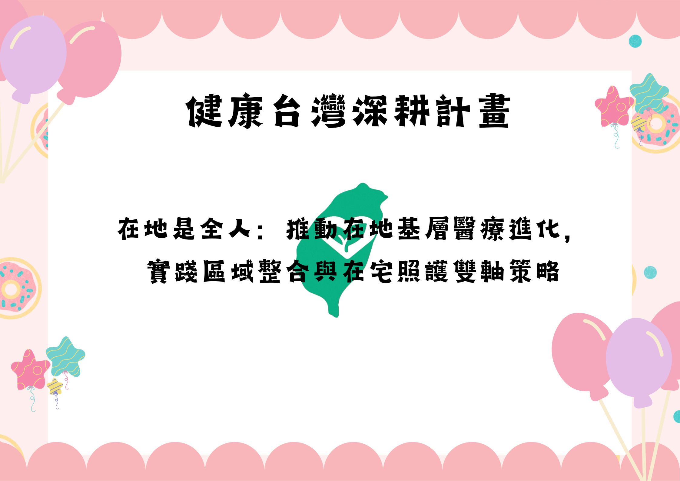 一、「健康台灣深耕計畫」係依據賴總統國家希望工程-打造健康台灣政策,以「優化醫療工作條件」、「規劃多元人才培訓」、「導入智慧科技醫療」、「社會責任醫療永續」四大範疇(主軸)規劃,透過系統性改革,全面提升醫療環境體系,進而打造全民健康福祉,實現亞太地區最具醫 療發展力國家的願景。